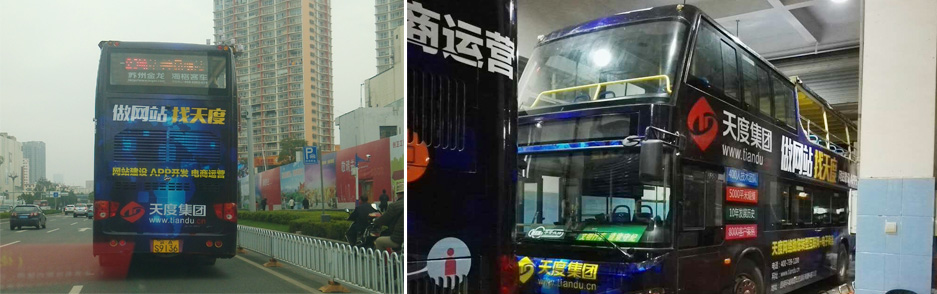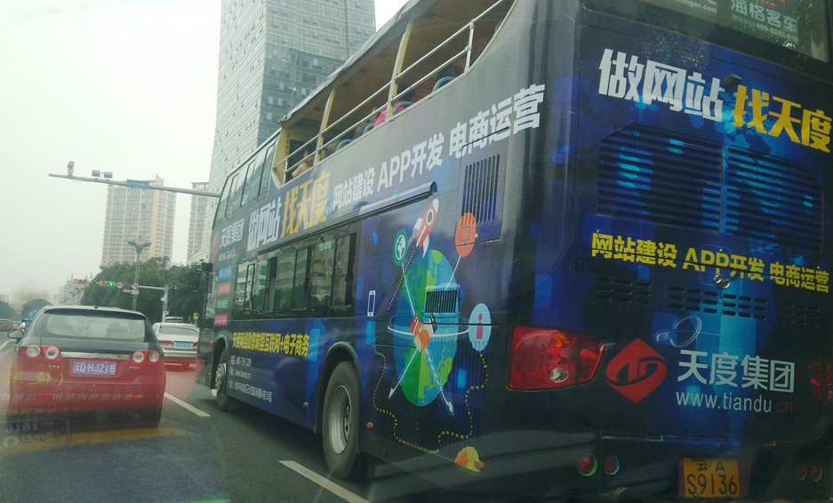天度集團(tuán)投入巨資進(jìn)行了昆明全城廣告覆蓋,作為云南很具規(guī)模和品牌影響的互聯(lián)網(wǎng)企業(yè),天度為加強(qiáng)品牌影響力,陸續(xù)投入了昆明主要干線雙層大巴公交車車身廣告、車內(nèi)靠背廣告、公交車電視廣告、機(jī)場大巴雜志封面廣告、市區(qū)基地各大路牌燈箱廣告、電梯廣告、市基地戶外LED大屏廣告、新高速收費(fèi)站廣告、影院LED廣告、商圈燈箱廣告、樓宇燈箱廣告、KTV燈箱廣告、平面報(bào)刊廣告、網(wǎng)絡(luò)廣告等。相信本輪廣告的投放,將加大云南企業(yè)家對(duì)互聯(lián)網(wǎng)轉(zhuǎn)型的認(rèn)識(shí),并促進(jìn)天度公司的快速發(fā)展。