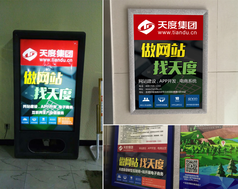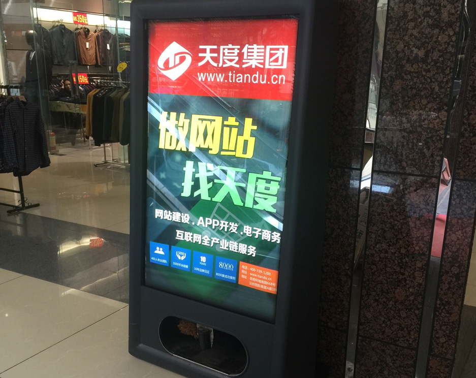 天度集團(tuán)在180個(gè)商城投入了巨幅燈箱廣告,覆蓋了昆明主城區(qū)絕大多數(shù)商城和城市綜合體樓宇。