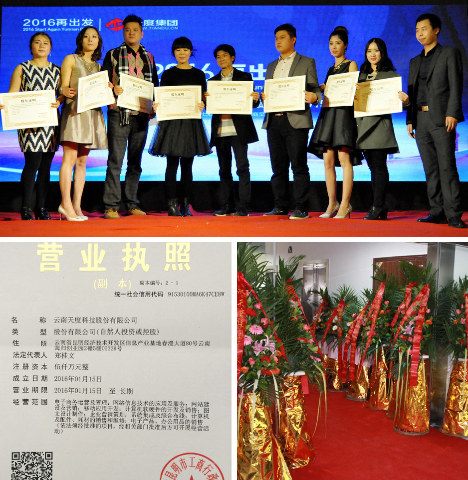 2016年1月28日,云南天度集團(tuán)董事長鄭桂文向所有獲得股份獎勵(lì)的員工頒發(fā)了《股權(quán)證書》,并將所有股東、董事、監(jiān)事提交到云南省工商行政管理局進(jìn)行了正式登記。