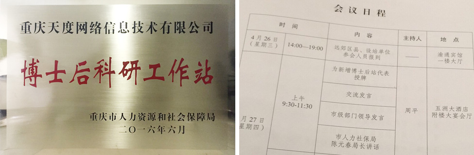 2017年4月27日,重慶市人力資源和社會保障局、重慶市博士后管理辦公室舉辦的“全市博士后工作會”在五洲大酒店召開,重慶市人社局陳元春局長為“重慶天度網(wǎng)絡(luò)信息技術(shù)有限公司”等新增博士后站進(jìn)行了授牌。