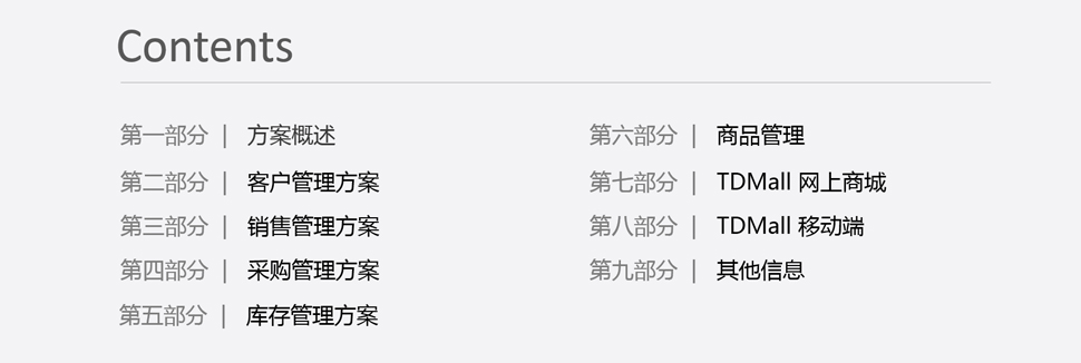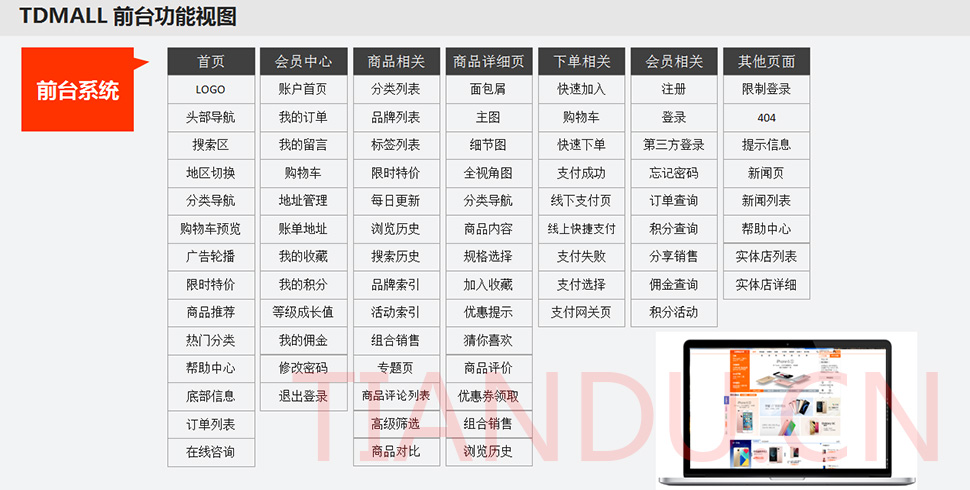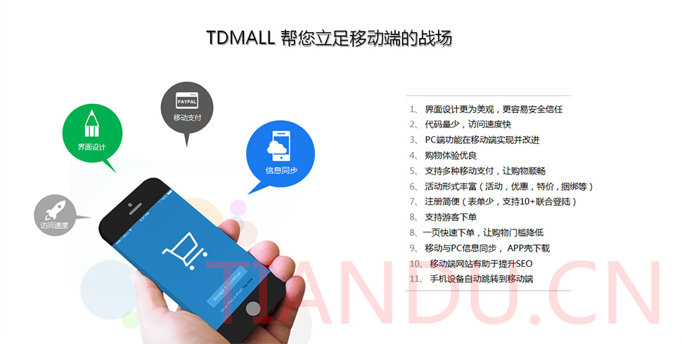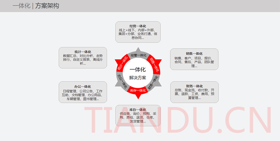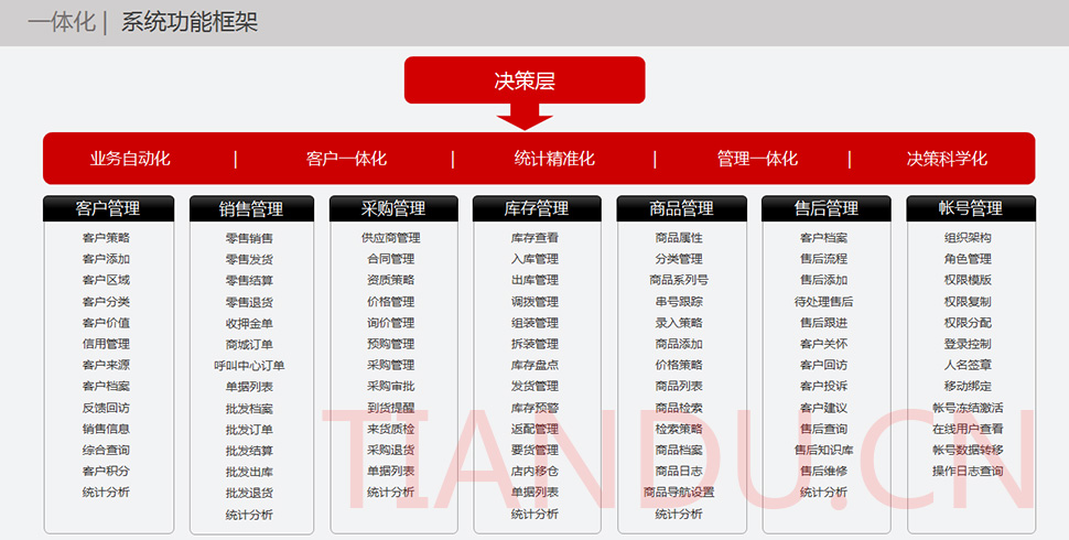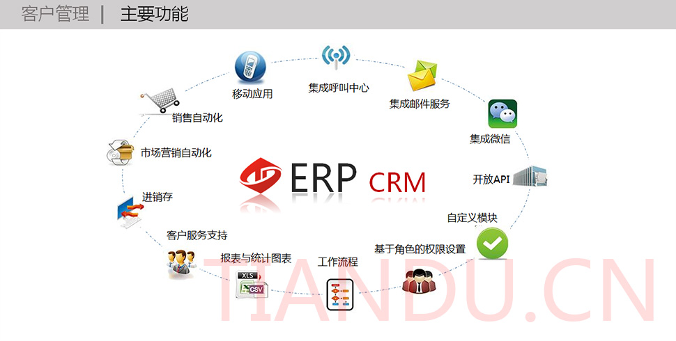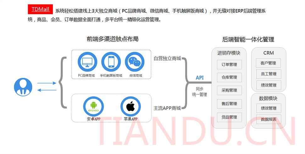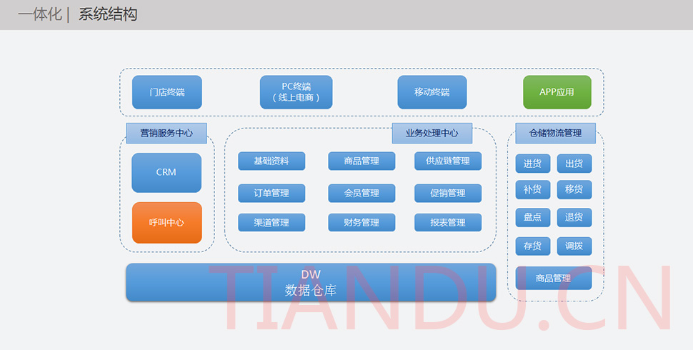 天度科技互聯(lián)研究院(博士后科研工作站)、天度軟件系統(tǒng)有限公司、天度科技股份有限公司合力近400人專業(yè)研發(fā)團(tuán)隊(duì),結(jié)合自身11年電子商務(wù)運(yùn)營經(jīng)驗(yàn),全力打造TDMALL電商ERP系統(tǒng):整合電商網(wǎng)站平臺(tái)(PC版、觸屏版、微信版、APP版)、ERP企業(yè)資源管理系統(tǒng)、CRM客戶關(guān)系管理系統(tǒng)、財(cái)務(wù)管理系統(tǒng)、OA辦公系統(tǒng)和Call Center呼叫中心等系統(tǒng),實(shí)現(xiàn)前端電商平臺(tái)及后端強(qiáng)大支撐系統(tǒng)的管理。
