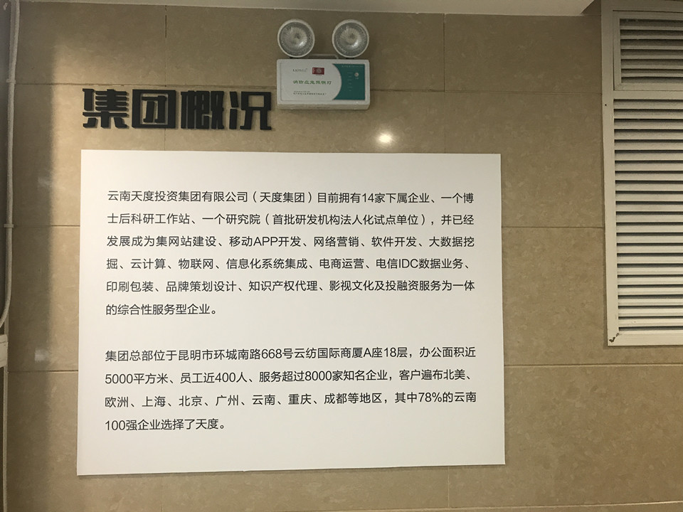 集團(tuán)概況的文化墻對面就是咱們天度更詳細(xì)的“集團(tuán)架構(gòu)”,分別羅列出了重慶、昆明、成都三個(gè)總部的子公司,讓客戶對天度集團(tuán)名下的子公司有更深入的認(rèn)識,也從正面證明了天度12年積累下來的傲人的成果。