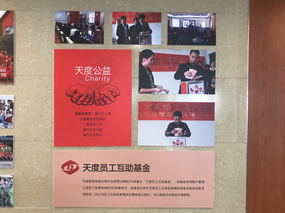 每一分榮譽(yù)證書的背后,都離不開為集團(tuán)默默付出的員工。天度集團(tuán)也珍視每一位員工,特別在集團(tuán)內(nèi)部設(shè)立“天度公益”,一個(gè)只屬于天度員工的互助基金,賬戶管理由全體員工投票選出三位同事?lián)危?dāng)公司員工及家屬發(fā)生重病或?yàn)?zāi)害時(shí),可以直接向該基金申請救助!