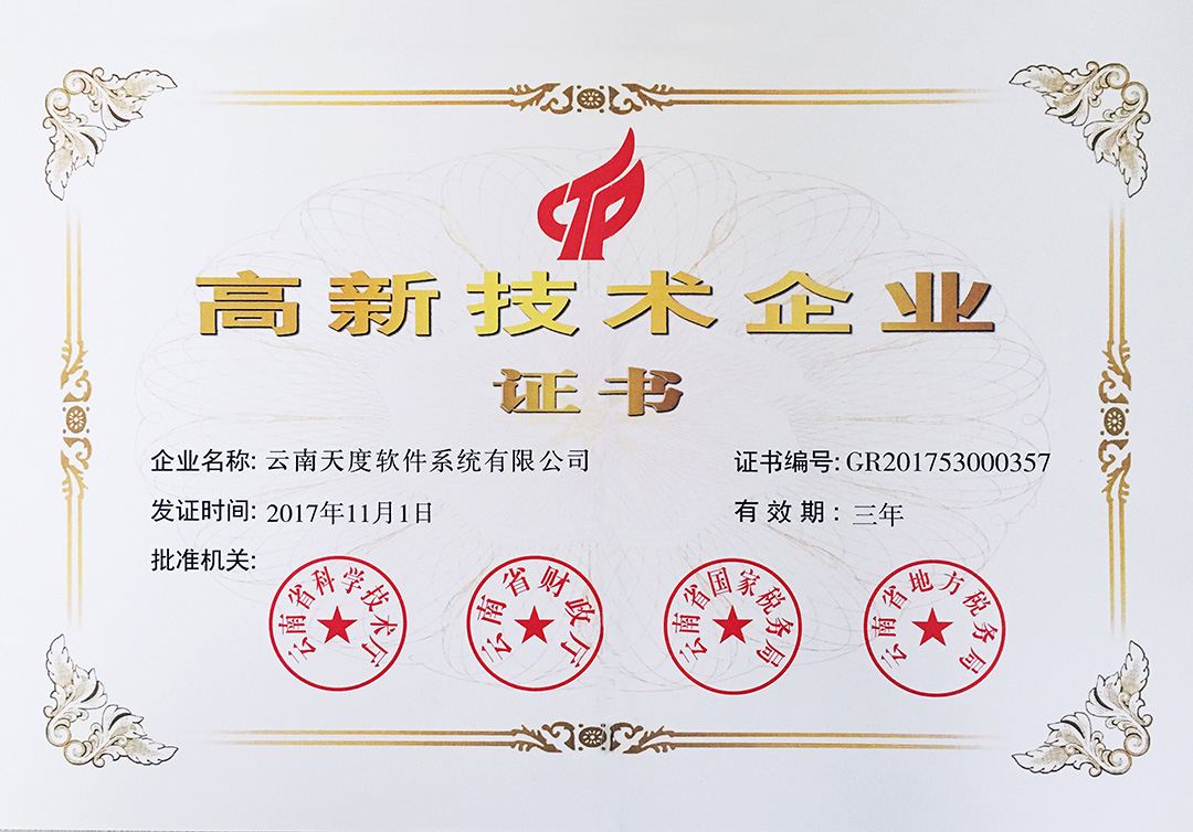 云南天度集團(tuán)旗下云南蔚嵐信息技術(shù)有限公司、云南天度科技股份有限公司、云南天度軟件系統(tǒng)有限公司、昆明天度網(wǎng)絡(luò)信息技術(shù)有限公司、重慶天度網(wǎng)絡(luò)信息技術(shù)有限公司等5家企業(yè)獲得國家高新技術(shù)企業(yè)認(rèn)定。
