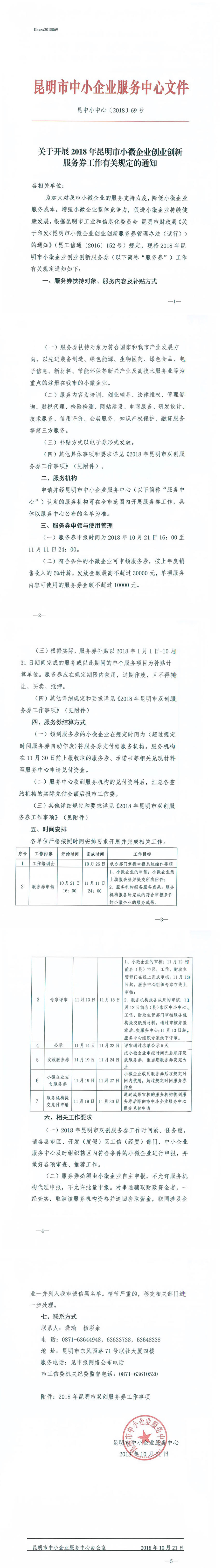 根據(jù)昆明市工業(yè)和信息化委員會 昆明市財政局《關于印發(fā)昆明市小微企業(yè)創(chuàng)業(yè)創(chuàng)新服務券管理辦法(試行)的通知》(昆工信通〔2016〕152號)(以下簡稱“管理辦法”)規(guī)定,為順利完成2018年昆明市小微企業(yè)創(chuàng)業(yè)創(chuàng)新服務券(以下簡稱“服務券”)申報、資金兌付等工作,制定如下工作事項。
