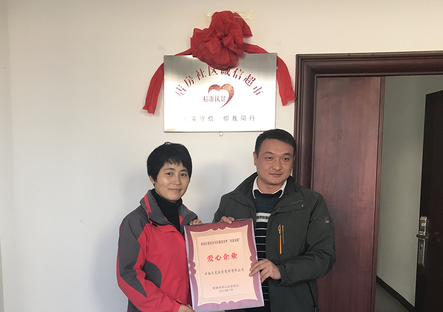 西山區(qū)科技局局長王敬紅、烏龍鎮(zhèn)鎮(zhèn)長楊勇、人大主席肖嬋姬、西山區(qū)扶貧辦領(lǐng)導(dǎo)等出席了捐贈儀式。店房村黨支部馬書記、店房村委會馬主任與楊總、宮副總一同對愛心超市進行揭牌。