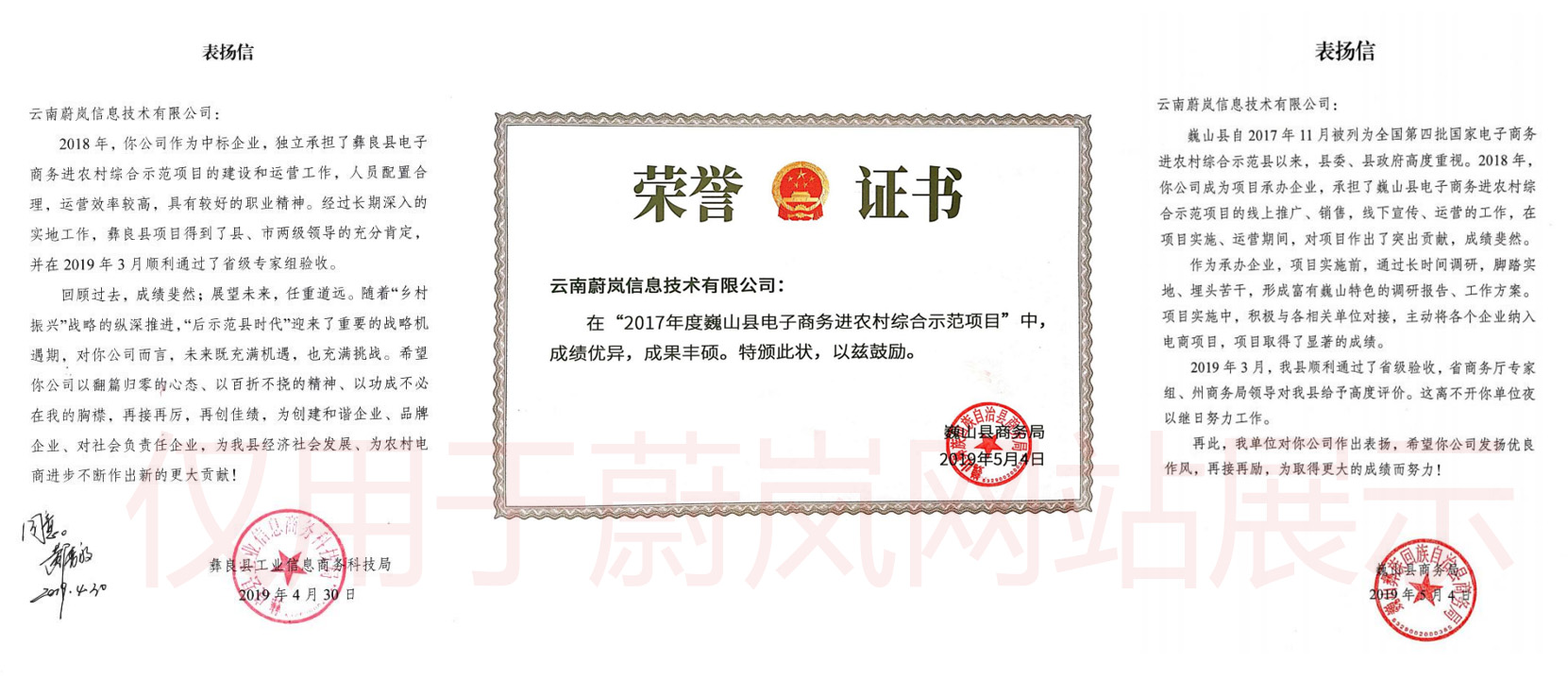 蔚嵐公司已中標(biāo)并承擔(dān)了西雙版納州級統(tǒng)籌、彝良縣、巍山縣、景東縣、景谷縣、孟連縣、勐臘縣、魯?shù)榭h、水富市、河口縣、峨山縣、盤州市等12個電子商務(wù)進農(nóng)村項目建設(shè)和運營工作,中標(biāo)臨滄市、文山市、水富市、蒙自市、個舊市、宣威市、 六盤水市 、麒麟?yún)^(qū)、馬龍區(qū)、陸良縣、永勝縣、 彝良縣、石屏縣、廣南縣、丘北縣等縣域商業(yè)建設(shè)行動服務(wù)商,參與和承擔(dān)玉溪市、隆陽區(qū)的中國好糧油行動示范縣、示范企業(yè)項目建設(shè)。