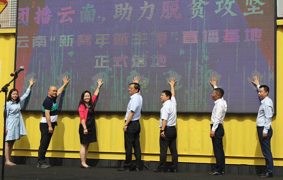共青團(tuán)云南省委黨組成員、副書記趙攀峰,云南廣播電視臺黨委委員、紀(jì)委書記曹渭海,云南省委統(tǒng)戰(zhàn)部新的社會階層人士工作處副處長歐陽美怡,云南省委網(wǎng)信辦社會工作處副處長陳茵,云南廣播電視臺音樂頻率副總監(jiān)陳友國,云南紡織(集團(tuán))股份有限公司黨委副書記、紀(jì)委書記、云紡科技園執(zhí)行董事李俊,云南天度投資集團(tuán)有限公司董事長鄭桂文等7位嘉賓共同按下掌紋,開啟本次直播基地活動。