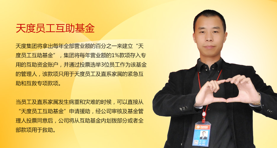 天度集團(tuán)將拿出每年?duì)I業(yè)額的百分來(lái)建立“天度員工互助基金”,集團(tuán)將每年?duì)I業(yè)額的近一成款項(xiàng)存入專(zhuān)用的互助資金賬戶(hù),并通過(guò)投票選舉3位員工作為該基金的管理人,該款項(xiàng)只用于天度員工及直系家屬的緊急互助和互救專(zhuān)項(xiàng)款項(xiàng)。